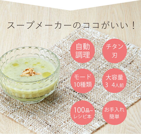 ボタンひとつでシェフの味! 【商品特長】 ■スープ3〜4人分用 ■「加熱」から「混ぜる」まで自動調理 ■切った材料を入れ、約30分で本格スープに ■野菜の「栄養」と「美味しさ」もそのまま ■手作りジュース・豆乳・スムージーなど、100種類以上のレシピ付き ■少量(2人分)調理できる「ハーフ」モード搭載 ■「下ごしらえ」モードで離乳食などの調理をサポート ■三段階のミキサースイッチ(低速・高速・フラッシュ) ■パーツ分解可能でお手入れもラクラクく ■切れ味がよく、丈夫なチタンコーティング刃 【商品仕様】 【本体サイズ】約220×150×311mm 【重量】約3.7kg 【定格容量】800ml 【電源】AC100V 50/60Hz共用 【消費電力】750W(ヒーター600W、モーター150W) 【コードの長さ】1.5m 【本体保証】ご購入から1年 【付属品】取扱説明書、レシピブック、保証書、容器締め付け台、ザル・ザルハンドル、下ごしらえ用アタッチメント・オーリング、ヘラ 野菜が苦手なお子様の健康のために。